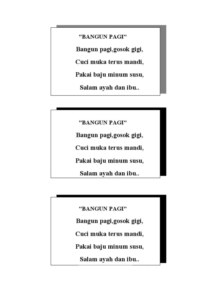 Bangun pagi, gosok gigi, cuci muka, pakai baju, makan roti, minum susu, pergi sekolah, senang hati.